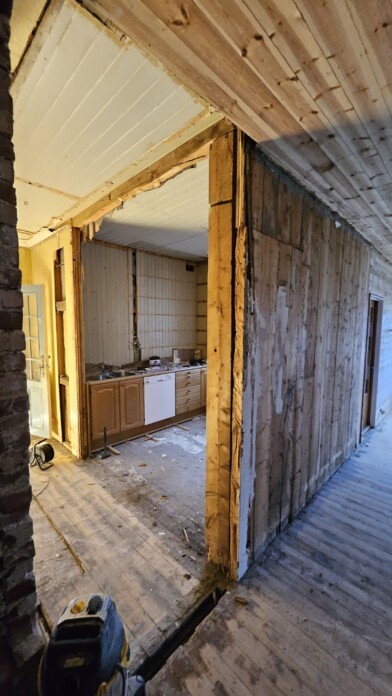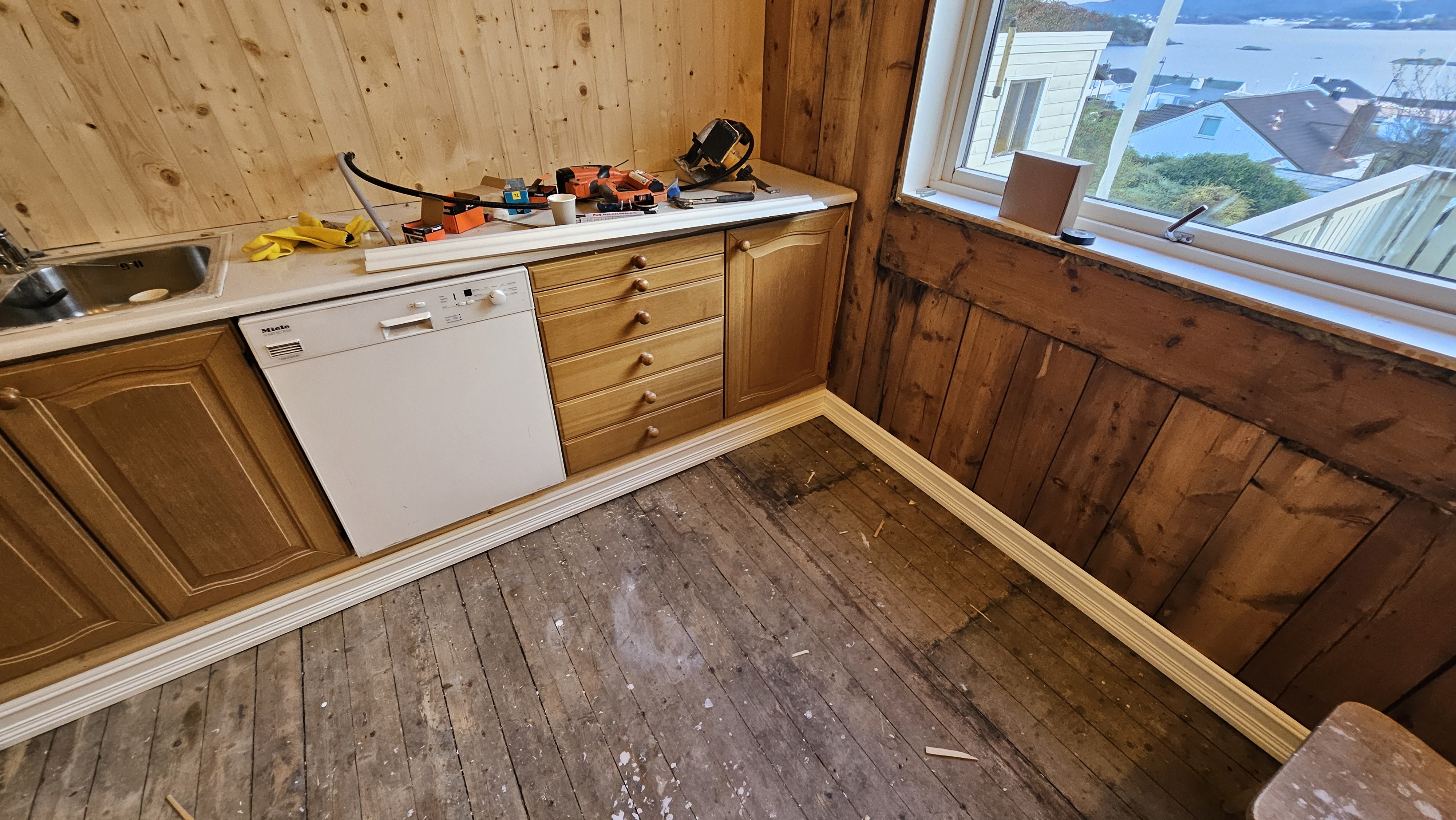 Som med resten av rommene i Villa Nøysomheten, startet Kjetil med å rive og demontere. Flere av skapene og benkeplatene ble fjernet. Så forsvant tapeter, veggplater og himlinger. Lag lag. Her viste det seg som mange andre steder i huset at det som befant seg helt innerst var kvalitetsmaterialer fra byggeåret.